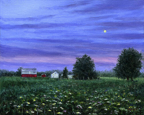 The moonlight, described as “staring out across the distant wheat fields,” personifies the moon, giving it a contemplative and almost wistful character. This personification continues as the moonlight “daydreams of her glory,” evoking a sense of nostalgia and longing for recognition. The moon’s gaze along the orchard fence line, where the old farm dog stands guard, highlights the protective vigilance that permeates the night.
